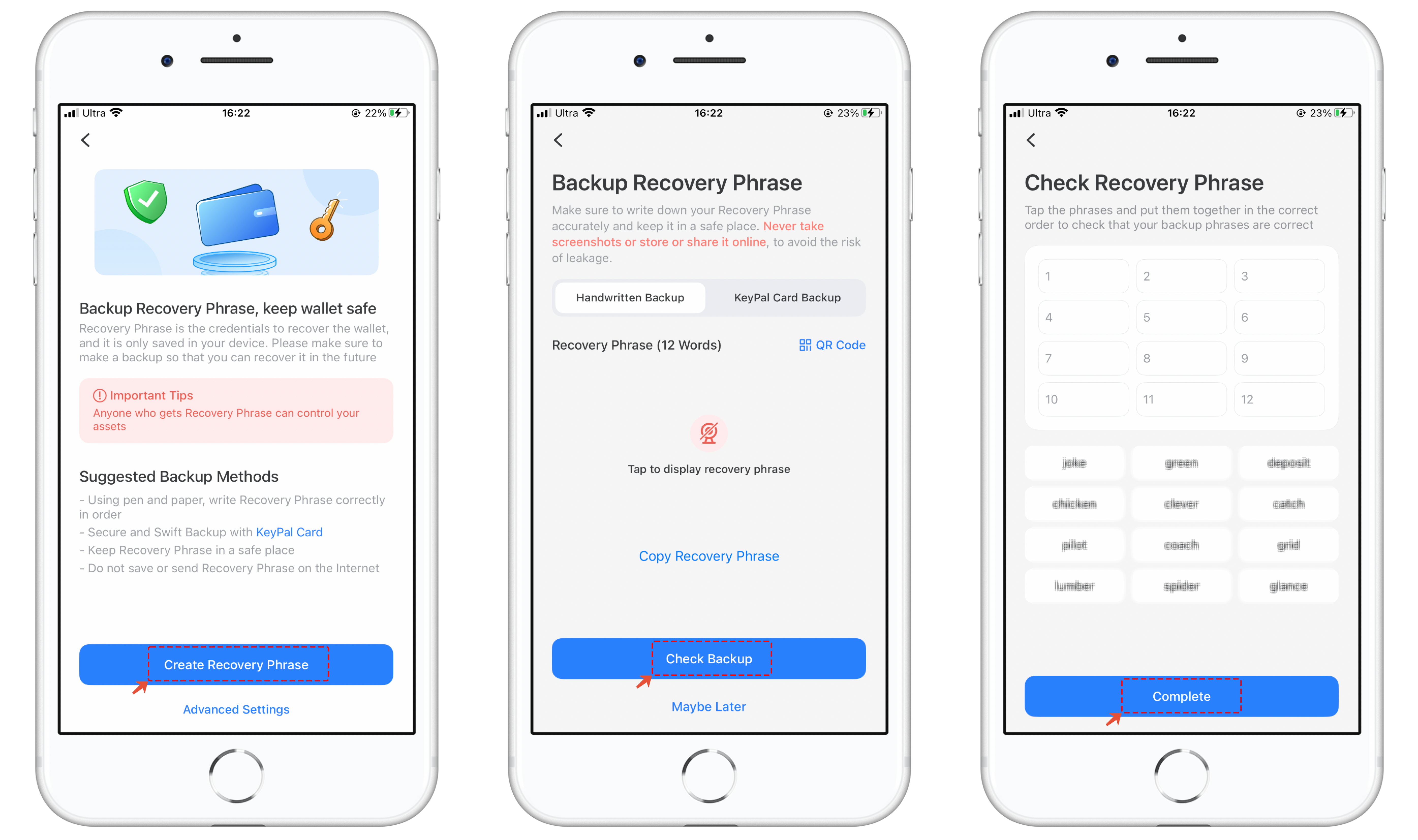 3. Back up the secret recovery phrase on the paper, and store it in a safe place. Click **\[Completed backup]**  and verify your secret recovery phrase.