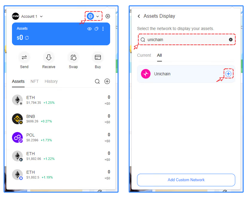 1. Open the TokenPocket APP, click ![](https://help.tokenpocket.pro/~gitbook/image?url=https%3A%2F%2F659607907-files.gitbook.io%2F%7E%2Ffiles%2Fv0%2Fb%2Fgitbook-x-prod.appspot.com%2Fo%2Fspaces%252F-MMJyYRLFVRsMrfcXuRV%252Fuploads%252FUjYAAs2G6BZ8CNsYXCiH%252Fimage.png%3Falt%3Dmedia%26token%3D9adac656-510e-4346-8334-d99ad71f1417\&width=300\&dpr=4\&quality=100\&sign=51b8ebd8\&sv=1) on the upper right corner, click the search bar, and enter Unichain;