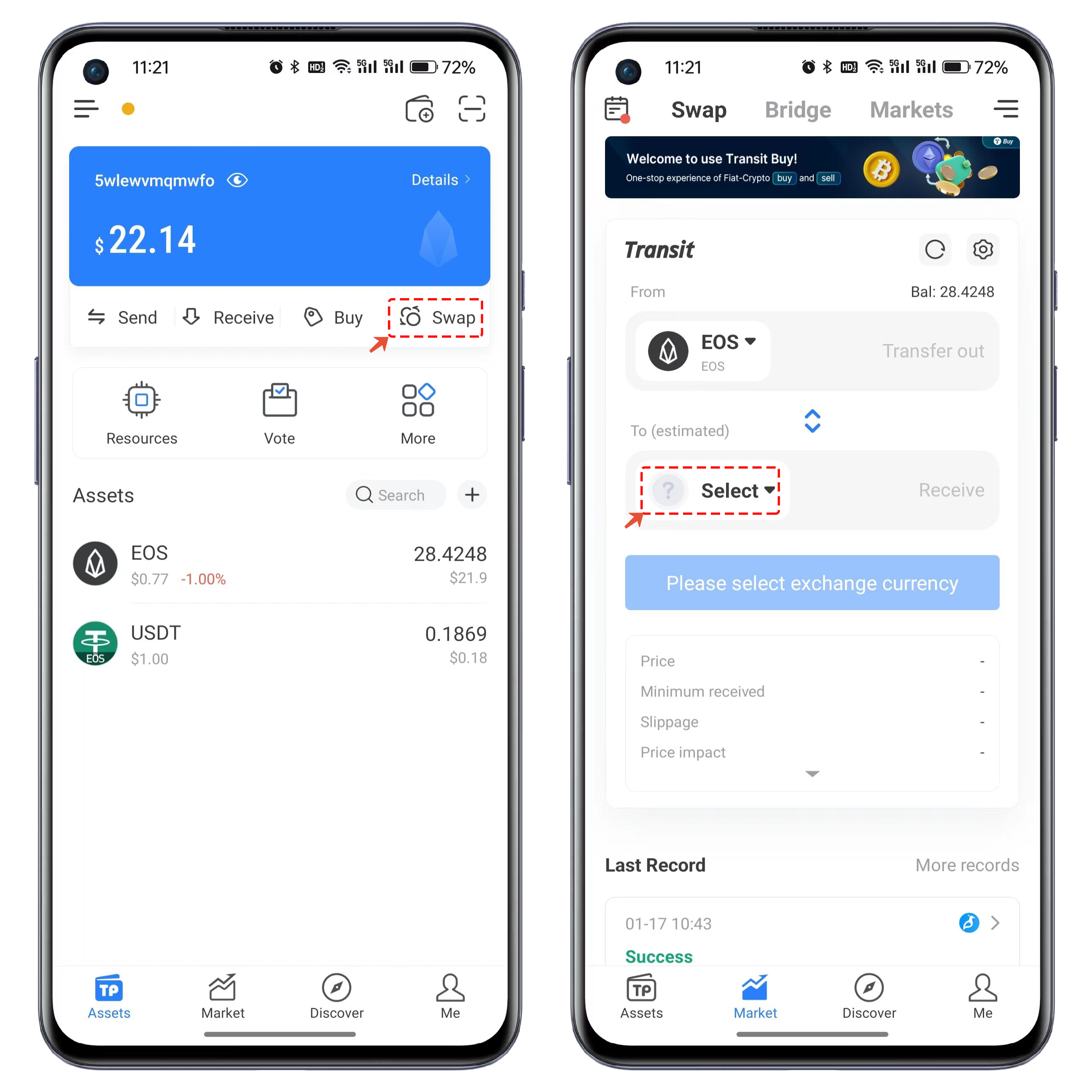 1. Open the EOS wallet on TokenPocket and click on the "Swap" function to enter the exchange interface. Click on the specified location in the image to choose the type of token you want to exchange and receive.