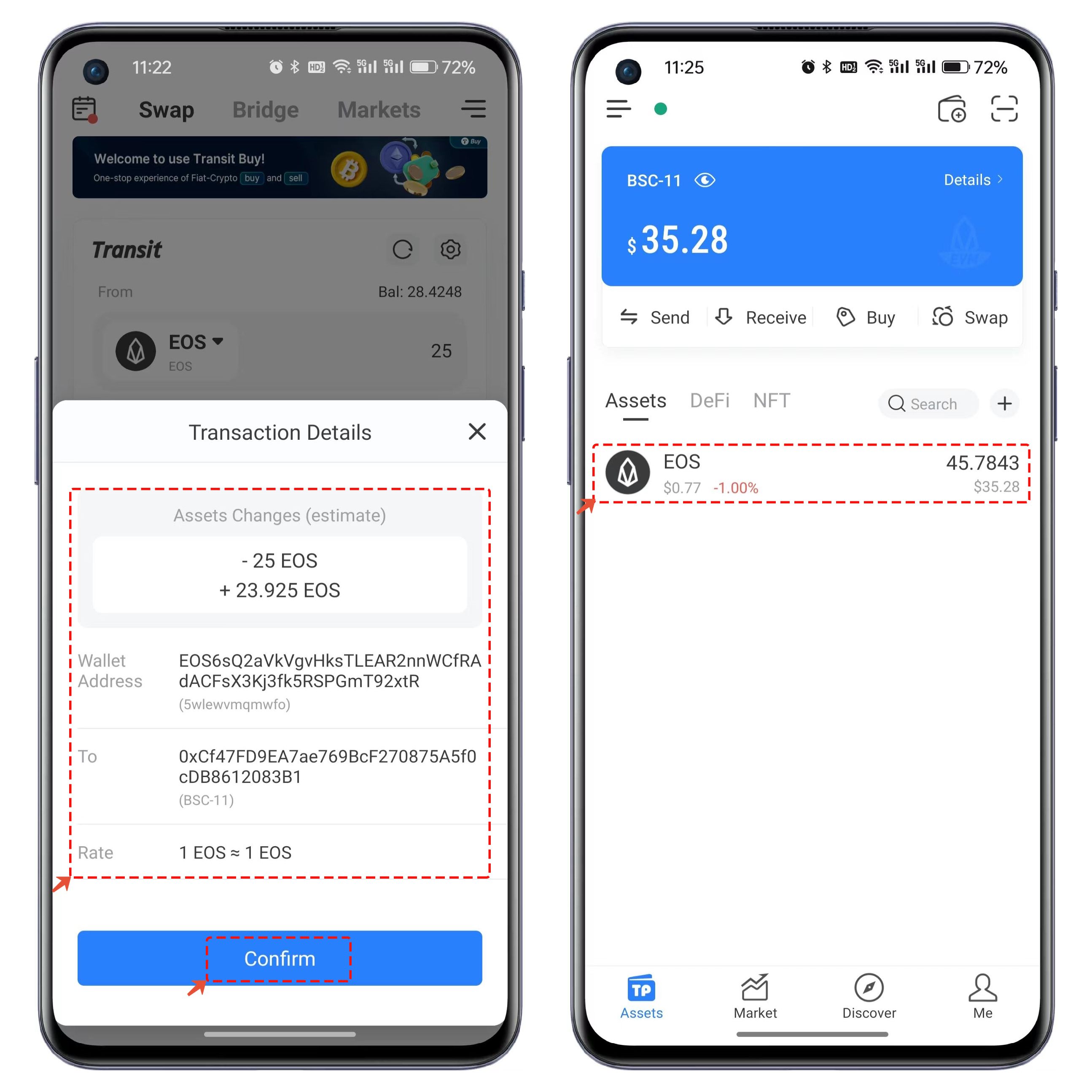 3、In the wallet list, select the address to receive the tokens, set the amount to be transferred, and please note that the minimum quantity for the current EOS token exchange is 23. After confirming the information, click on "Confirm"