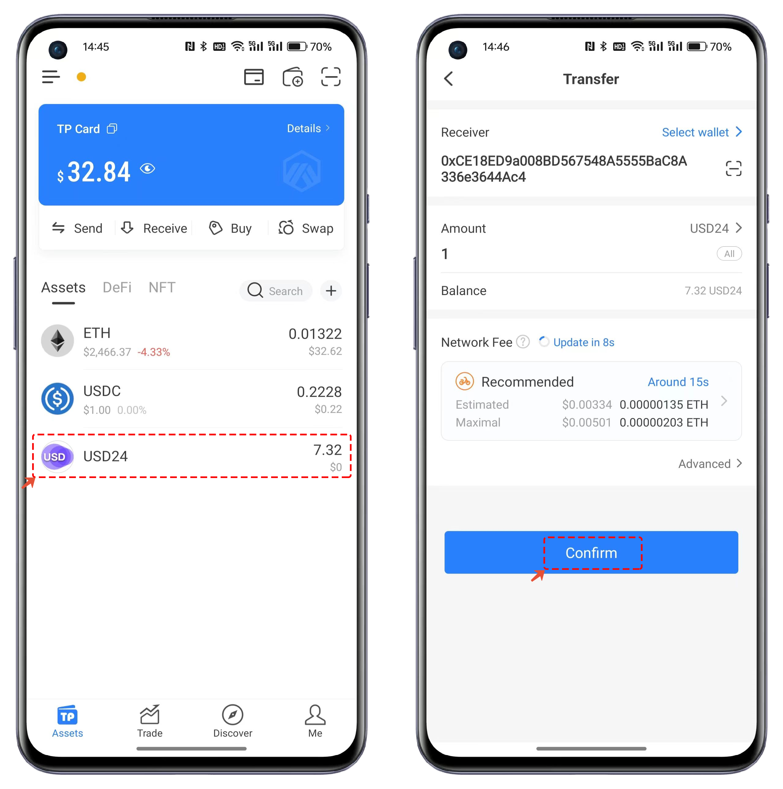 The asset transfer in TP Card is similar to a regular token transfer. You simply click on the token, set the recipient's address and the amount in the transfer interface, and then confirm to send it on-chain.